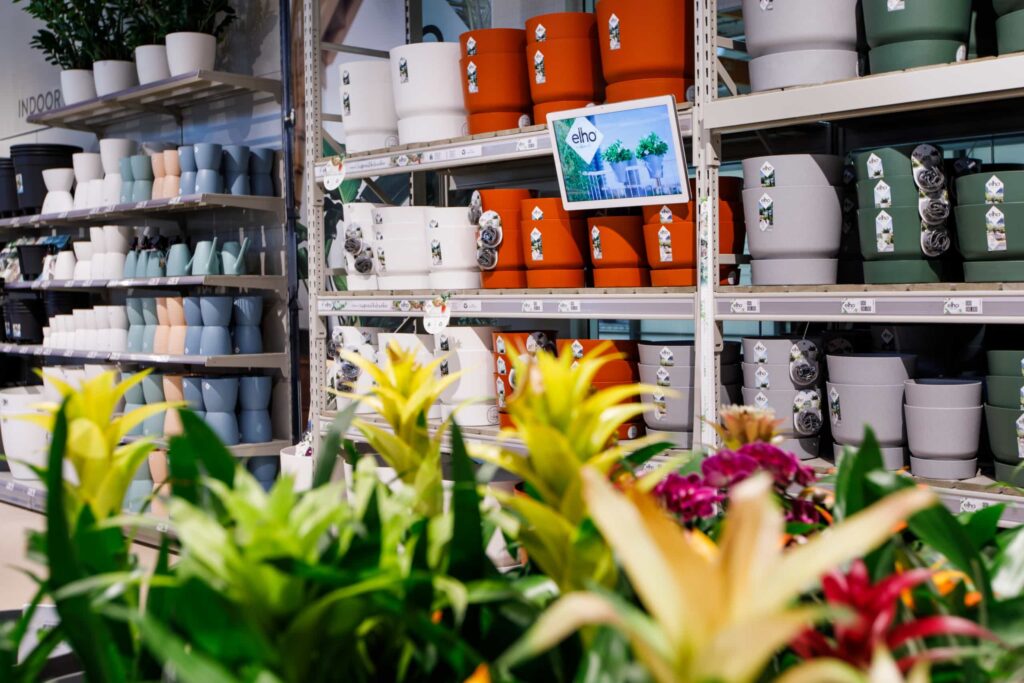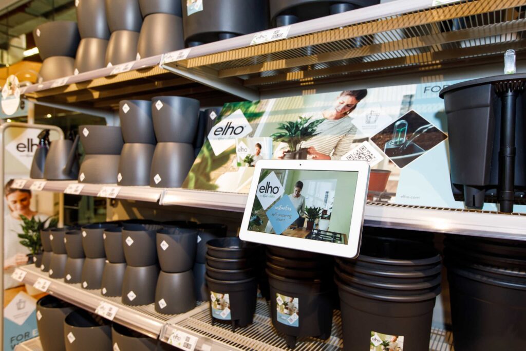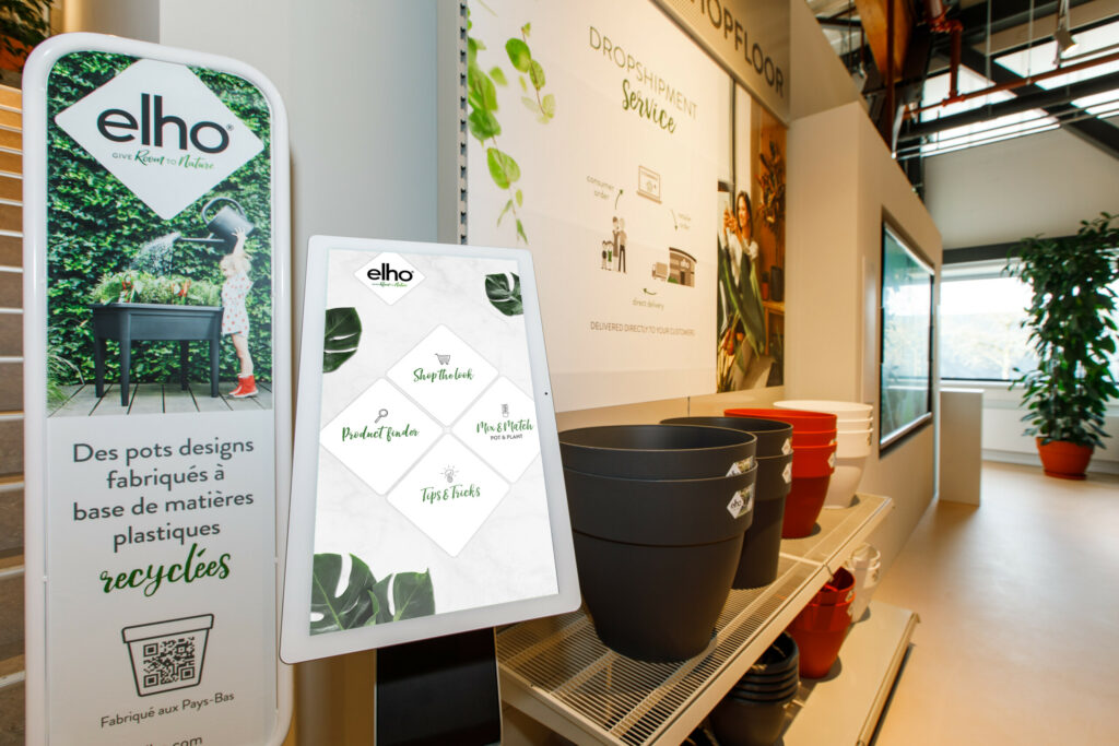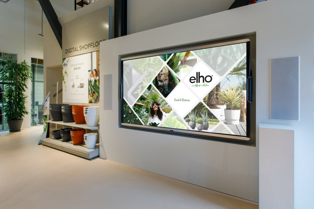 When you are a guest at Elho, you are welcomed by a video wall. Through the kiosk display stand, you can make convenient use of the product finder, mix & match pots and plants, see tips & tricks and find plant inspiration. If you stand at one of the shelves, the shelf displays provide additional Elho inspiration and helpful tips. The central narrowcasting ensures that the custom-made display cabinets generate even more inspiration. Extra special: the cabinets can move!