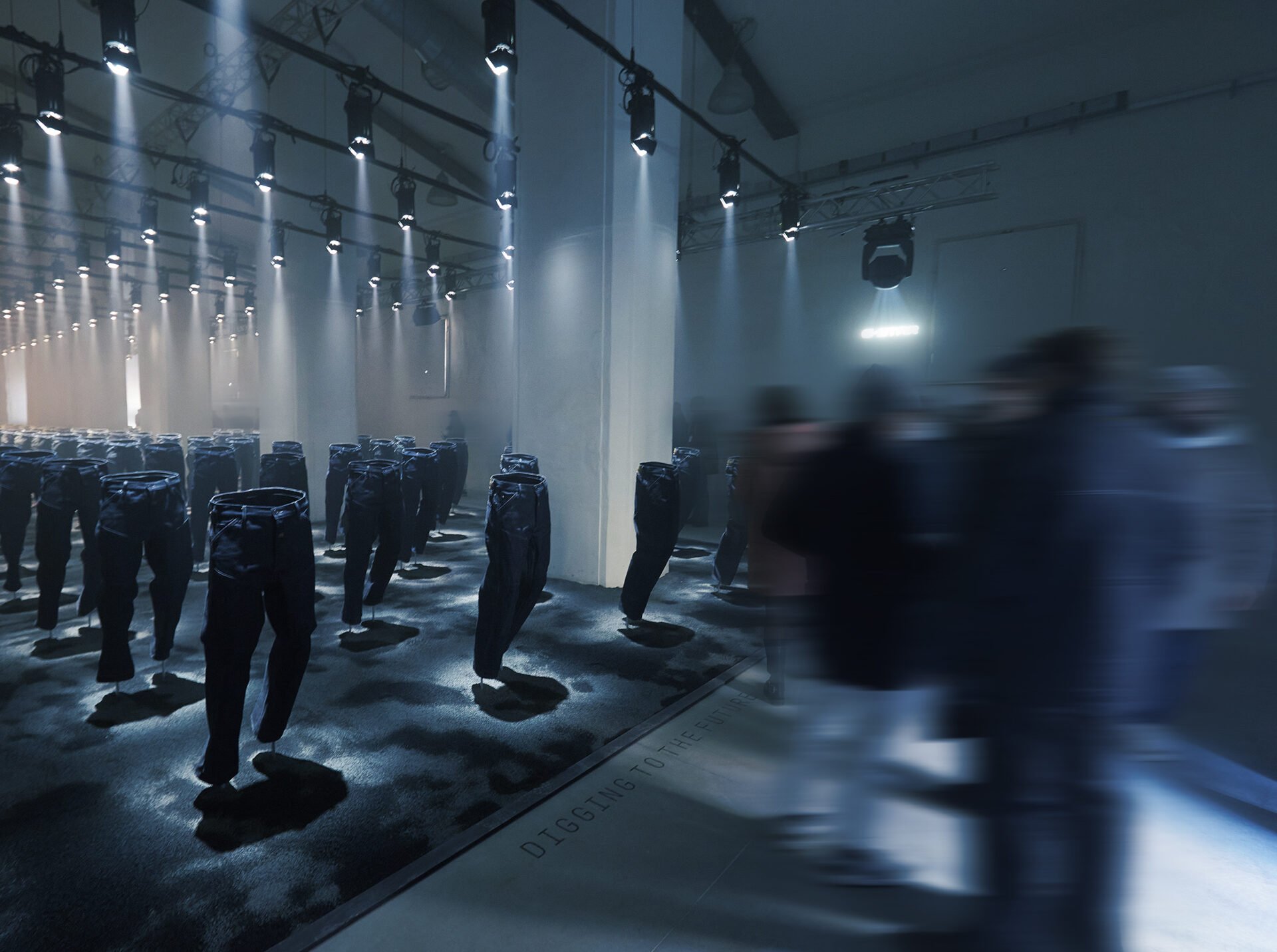 Every beam had a purpose. Using 150 ultra-light Scena LED Fresnels, we gave depth, shape, and shadow to over 70 denim sculptures. With minimal overhead load, we sculpted the space from the ground up, literally. No rigging. No heavy gear. Just clever modular trussing and absolute control. Custom gobos projected G-STAR iconography across surfaces. A haze system made light tangible. Lighting wasn’t decorative. It was narrative.