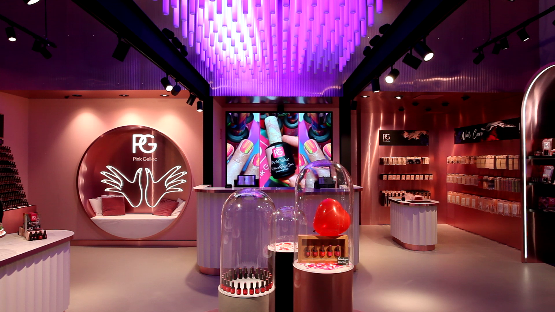 A diffuser spreads a recognisable scent developed specifically for the Pink Gellac brand.