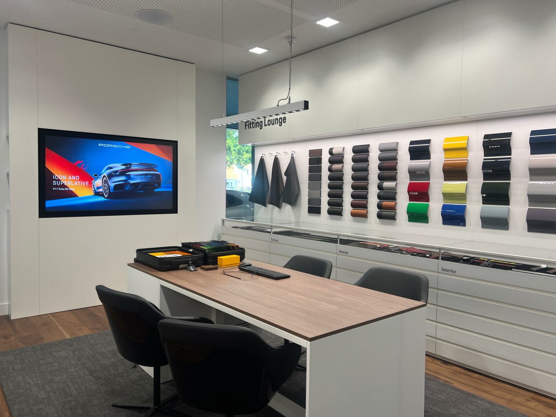 Bij de fitting lounge hebben we de hardware voor de car configurator geïnstalleerd. Hier kunnen klanten digitaal via het touchdisplay hun droom-Porsche samenstellen, maar ook materialen als stof, leer en lak in het echt voelen. Het configureren van een auto wordt hiermee een phygital beleving – een zintuiglijke reis die verder gaat dan het scherm.