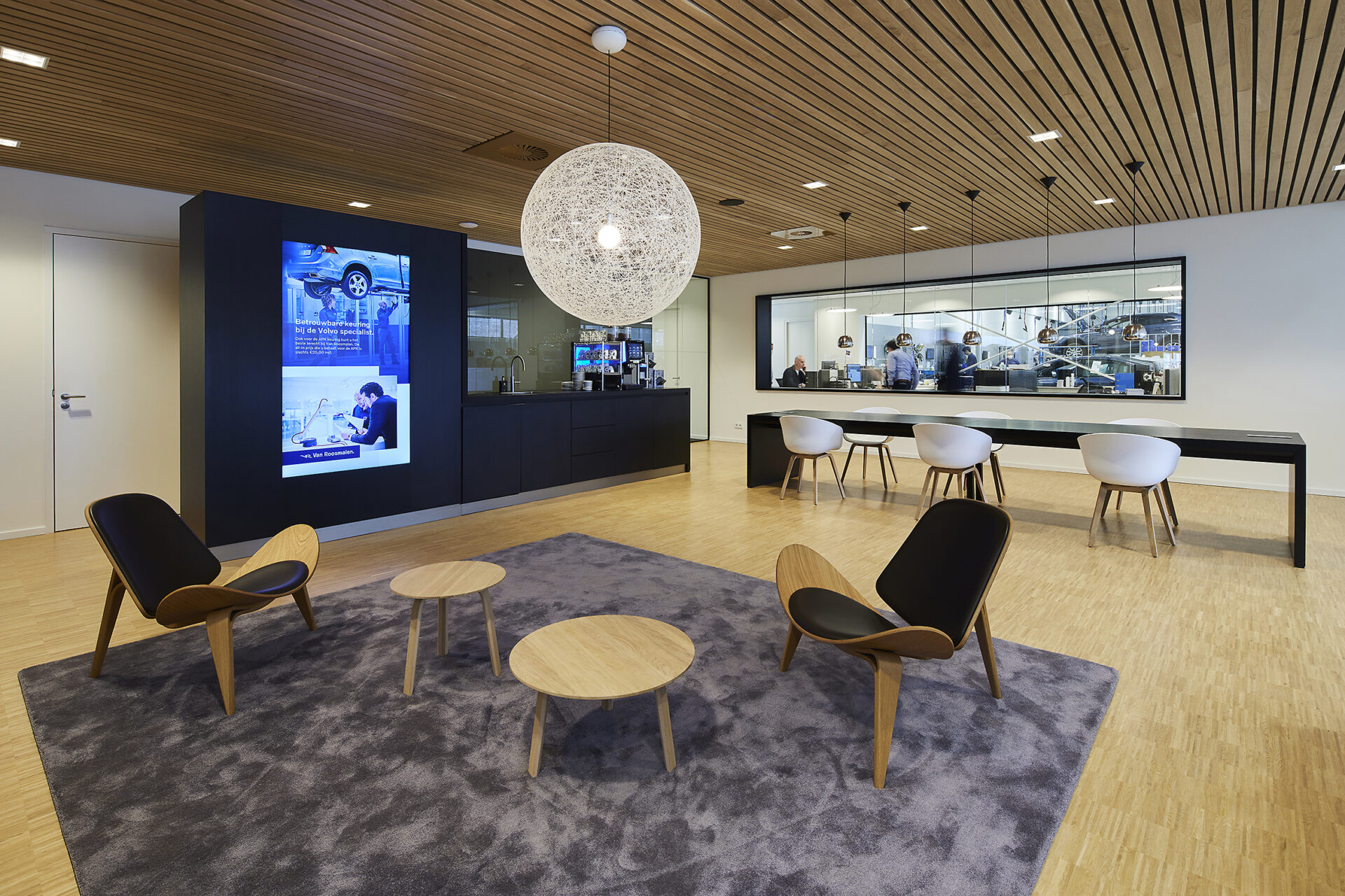 In the space where customers have to wait a little longer for the car to be ready, we try to ease the wait. Right-time, right-place communication through diverse displays. We provide a subtle mix of reading material; news and weather reports or messages from the dealership itself, such as “Think about changing your tires”.